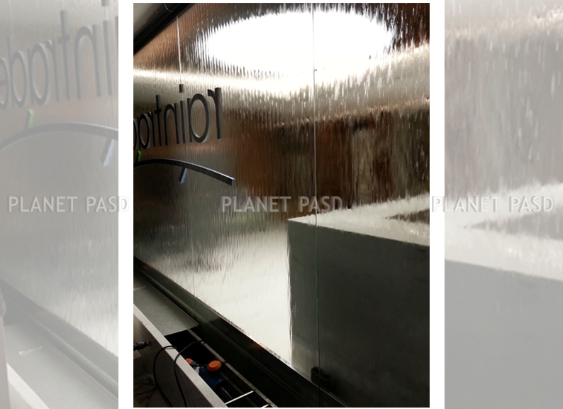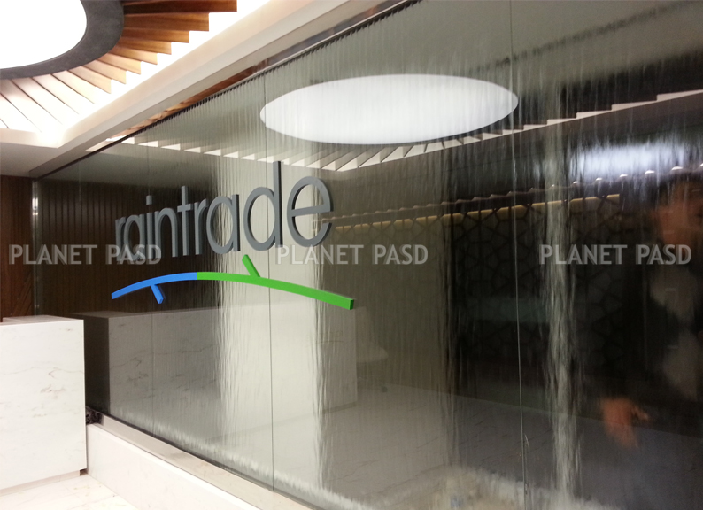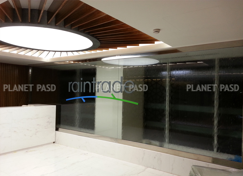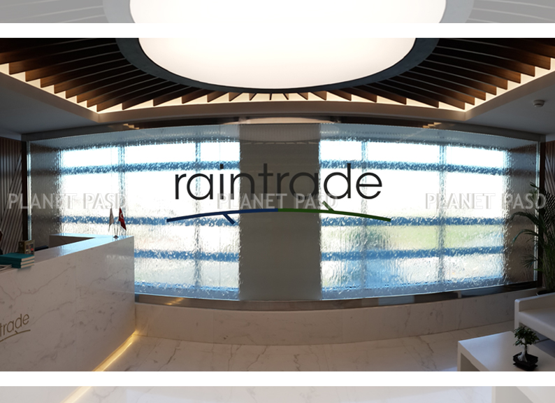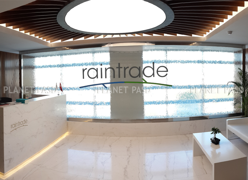 Raintrade Nida Kule ofisi özenle tasarlanmış bir proje oldu. Biz de projeye giriş noktasında yerimizi alarak keyifle çalıştık. Karşılama deskinin yanında konumlanan cam su perdesi, dışarıdan gelen ışığı su akışı ile filtreleyerek, manzarayı içeriye silüet olarak verdi. Suya temas edilmesinin istenmediği zamanlarda yaptığımız çözüm olarak su akışı arka tarafa alındı. Ayrıca su perdesi, logo için de bir fon olarak kullanıldı. Projede mermer, ahşap ve su dokuları ahenk içinde bir araya geldi.